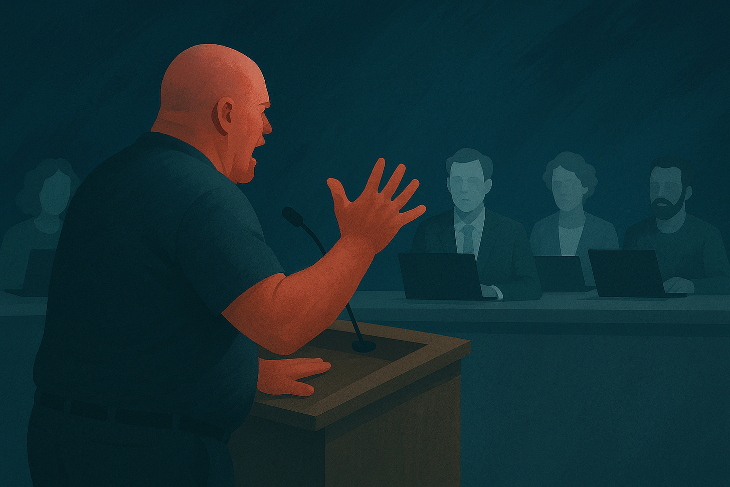 Brendon Klein stepped back from the podium, his bald head reddening as veins popped along his neck. He slapped the lectern with the flat of his hand—firm but performative—then raised both arms like a dealer clearing the table and lumbered back to his seat.
