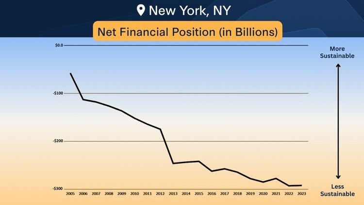 Here’s a clue: As of the end of 2023, New York City had already spent nearly $300 billion of future revenue—almost three times its annual intake. The Finance Decoder shows that its Net Financial Position is deeply negative. And the two-decade trend is a steep decline.