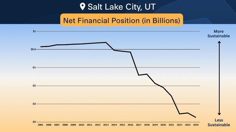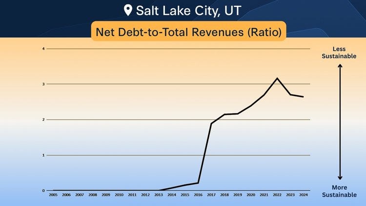 Yet, despite this increase in available revenue, the Finance Decoder shows Salt Lake City’s Net Financial Position continuing to decline.