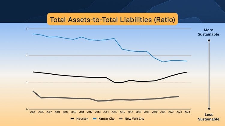 In plain terms, New York City is insolvent. The Finance Decoder shows its obligations are more than double its assets. I’ve written before that places like Kansas City and Houston are in trouble, but New York’s situation is far worse. Kansas City is trending to insolvency. Houston is flirting with insolvency. New York has been insolvent as far back as we could collect data.
